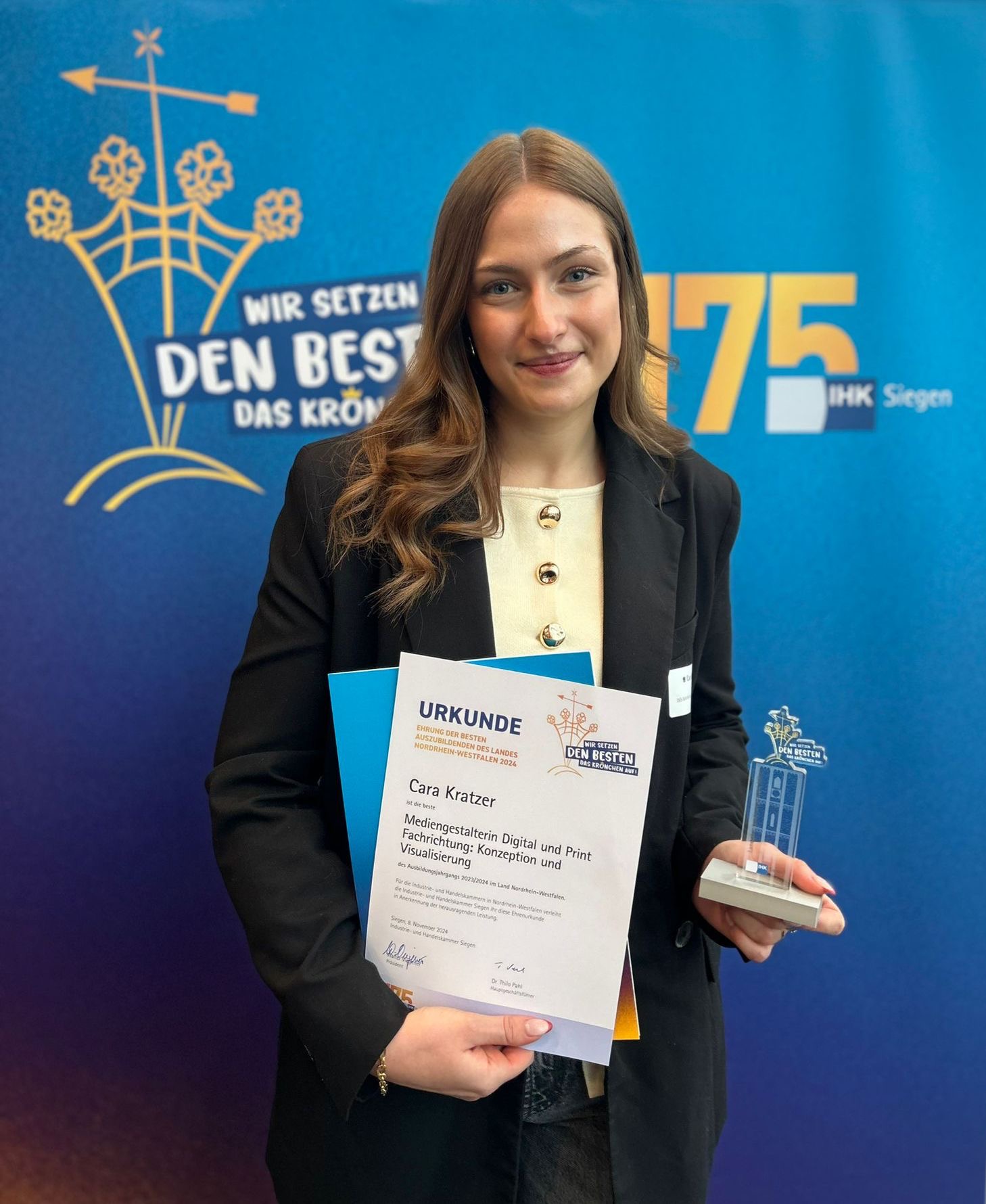 Auf diese herausragende Leistung kann sie wirklich stolz sein. Das findet auch die IHK und ehrte die landesbesten Auszubildenden unter dem Motto “Wir setzen den Besten das Krönchen auf” bei einer Festgala in der Siegerlandhalle.